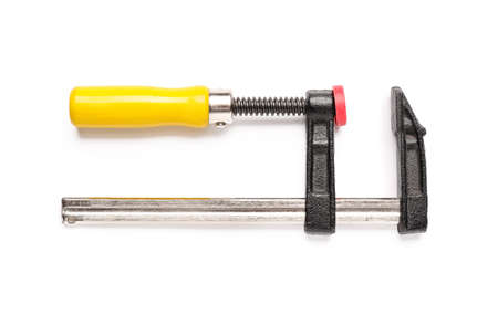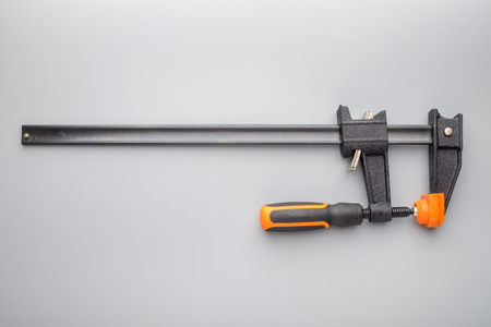 Carpenter's clamp used in a carpentry shop. Metal joinery accessories. Light background.