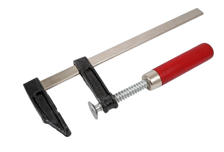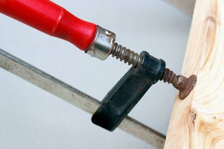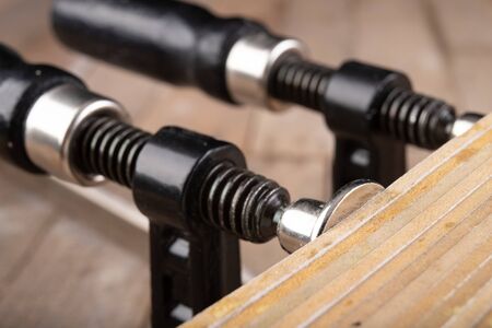 Carpentry clamp used for gluing wood. Small carpentry work in a home workshop. Light background.