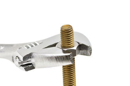 Close-up view of a locking pliers tool holding a threaded bolt, showcasing the metallic shine and craftsmanship in a blurred workshop environment.