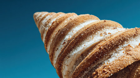 A close-up view of a tempting ice cream cone featuring swirled toppings, set against a bright blue background.