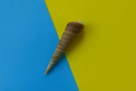 Top view of seashell on two color background which are blue and yellow.