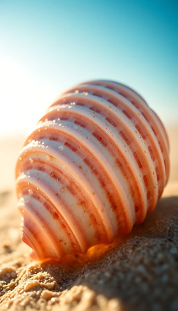 A beautiful close-up of a striped seashell resting on the wet sand at the shoreline, gently lapped by the ocean. The warm, golden light of sunset or sunrise illuminates the shell's intricate patterns and the sparkling grains of sand. This tranquil image evokes peaceful memories of summer vacations and the beach.