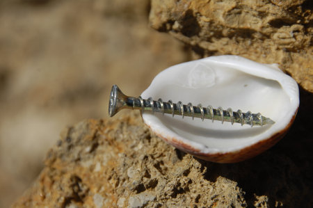 Screw in a shell on a rock. Close-up.