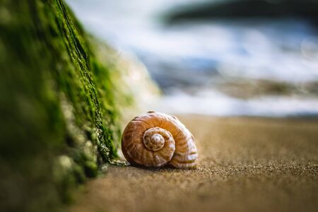Seashell on the beach in the evening light. Shallow depth of field