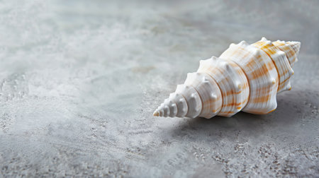 A close-up captures a pristine conch shell, its pearlescent surface reflecting light. The shell exhibits a textured exterior with a prominent spiral. Soft shadows define the form against a neutral background. This image is suitable for various commercial uses, including website design or editorial content.