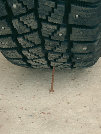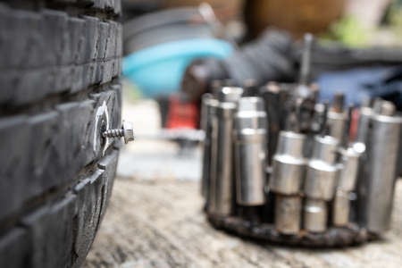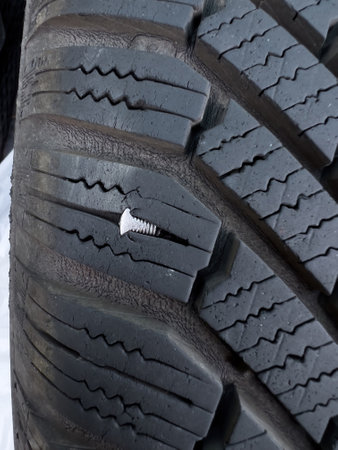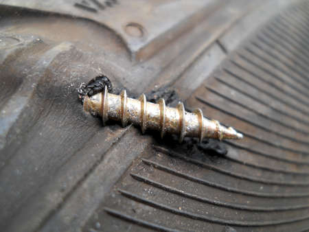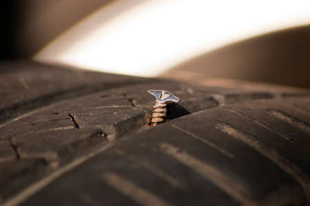 Close up of sharp metal screw puncturing into a car tire,flat tire,car tire leak by button head needle nut on the street,waiting for repair, tools or equipment on the background,problems on the road