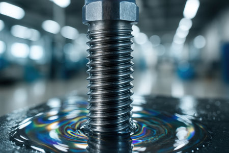 Metal bolt with detailed threads stands upright, emerging from a dark, reflective liquid surface with vibrant iridescent colors. blurred industrial background.