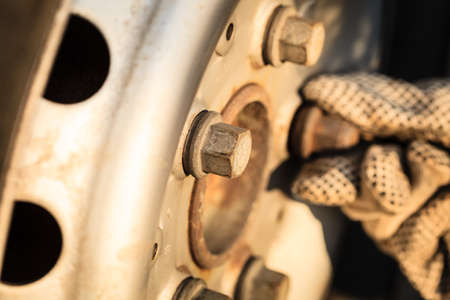 Closeup of person checking fixing bolts on vehicle tire with bare hands. outdoors photo