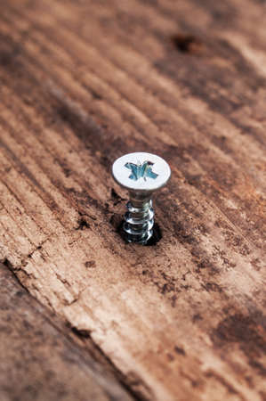 A close-up view of a metal screw resting on a wooden surface, showcasing intricate details and textures. Perfect for various design and industrial projects.