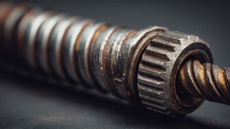 A close-up image of a rusty bolt showcasing detailed textures and wear on a rough surface, ideal for industrial and mechanical design concepts.