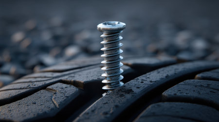 A striking close-up image of a metallic screw embedded in a car tire, showcasing intricate tread patterns with a blurred background that adds depth.