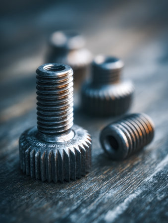 Intricate metallic fasteners display rugged textures and detailed craftsmanship, set against a softly blurred backdrop that emphasizes their industrial precision.