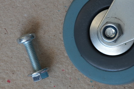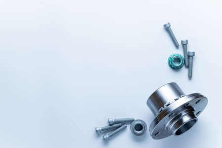Artwork from gray automotive bolts on blue background close up. Copy space.