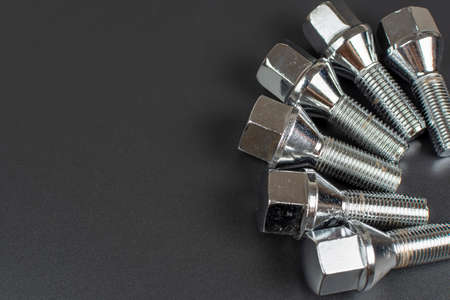shiny metal bolts fastening a car wheel close-up on a white background. car spare part
