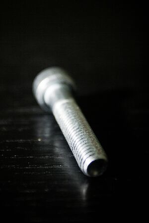 This close-up image features a detailed metal screw set against a dark surface. The dramatic lighting highlights the screw's texture and shape, making it ideal for hardware-related projects.