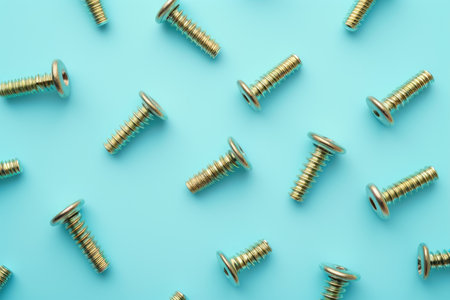 A lot of small silver screws lies on a light blue background. Minimal flat lay. Top view