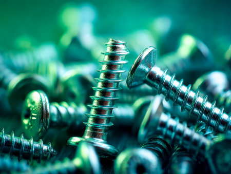 An array of gleaming metal fasteners with intricate grooves, catching light and creating vivid reflections, spread across a lush green surface ideal for building projects
