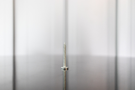 steel black self-tapping screw standing vertically on a plane close-up on a defocused background