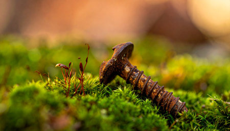 A rusty screw lies on lush green moss, with tiny red plant stems adding a touch of color to the detailed macro scene.