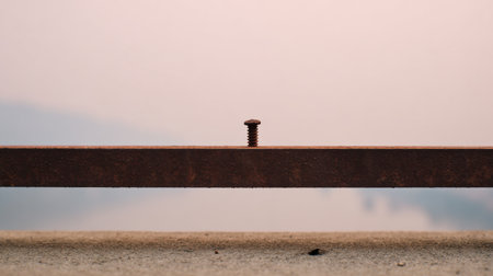 A stunning close-up view of metal screws on a reflective surface with a beautiful sunset backdrop, showcasing the intricate details and textures of the screws.