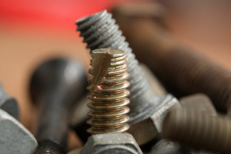 Rusty and shiny metal fasteners fill the workspace, highlighting their textures.