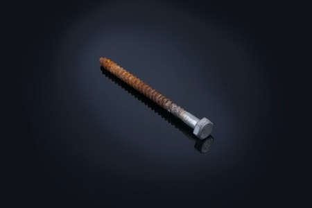 A striking close-up image of a rusty steel screw resting on a textured dark surface, showcasing intricate details and reflections in a dramatic light.