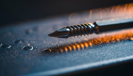 This close-up image showcases a metallic screw with a sharp point and washer on a textured dark surface, highlighting the details and craftsmanship.