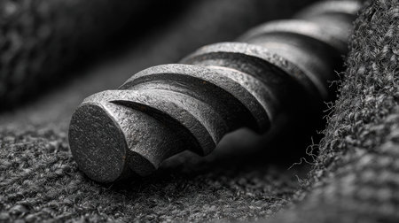 A close-up view of a metal screw resting on textured fabric, showcasing intricate details in a monochromatic palette, emphasizing craftsmanship and design.