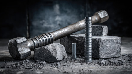 A striking composition of industrial metal hardware featuring a rustic bolt, nut, and stone elements, ideal for construction and engineering themes.
