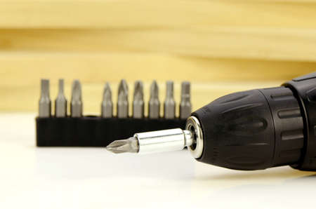 A set of different attachments for a head screwdriver with a screwdriver on a white background close-up