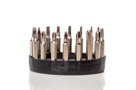 closeup of bit set with screwdriver chuck in background, isolated on white background