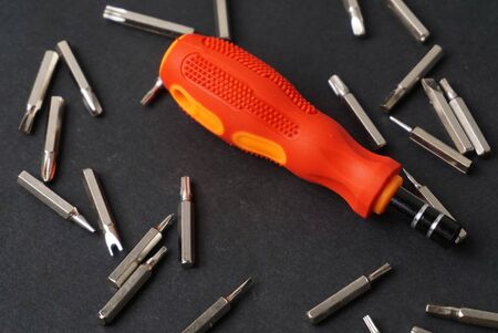 A set of screwdrivers with bits in a case on a dark background. Close up, flat lay, tools for work, copy space.