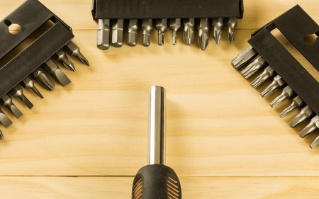 Selective focus of Many sizes screwdriver on the wood background with sunlight