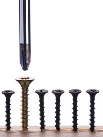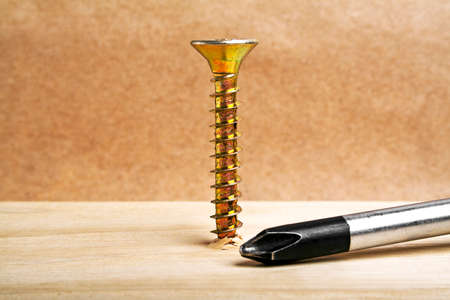 screwdriver and screws on a wood board, golden screws for construction, board and metal screws with a screwdriver for mounting, close up