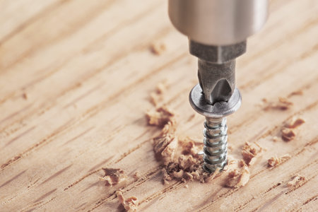 Screw being driven into a wooden board by a drill bit in a tight close-up. Hands-free fastening concept with clean background blur.