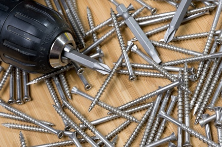 Old screwdriver and screws laying on the wooden background. Top view of the electric screw driver