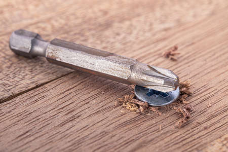Metal big Screws with screwdriver drill and screwdriver heads (bits) on wooden background. Close up stock photo.