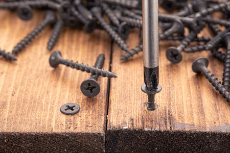 Screwdriver screw in a wood oaks plank. Self-tapping screw for PH2 bit. Screws macro photo. Construction abstraction. Industrial background.