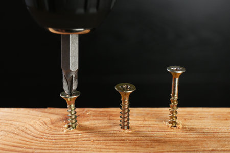 Screwing screw into wooden plank against dark background, closeup