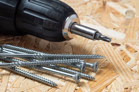 Electric screwdriver with torx bit and self drilling screws lying on chip board. Blurred background.