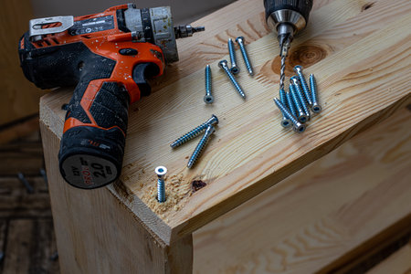 Yellow wood screws, electric drill and wooden table