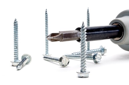 Horizontal view of screws and a power screwdriver on white
