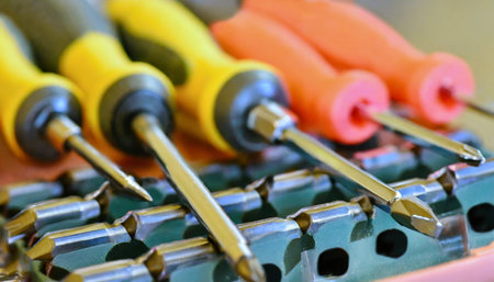 A selective focus shot of a new set of screwdriver bits lined up next to each other
