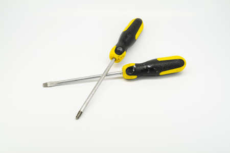 Set of screwdrivers with rubber black and yellow handles isolated on a white background.