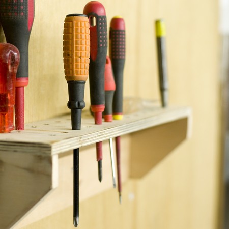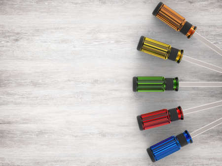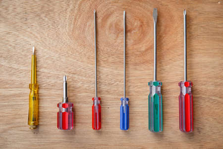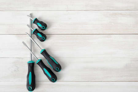 Set of screwdrivers. Tools over a wood panel. Top view with copy space.