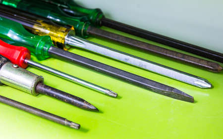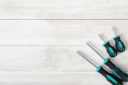 Top view and close up: Builder, repair and construction hand tool concept. There are screwdrivers on wooden table background.