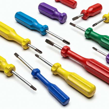 This image showcases a collection of screwdrivers with bright yellow handles, arranged neatly on a white background. Perfect for tool enthusiasts, DIY projects, and more.