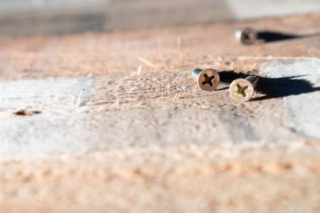 Golden screws on bottom with wood background. Photo of construction background.