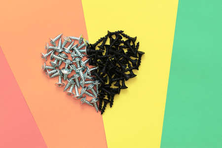 Heart of two opposite halves on a rainbow background, Valentine's card made of screws on colored paper, black and gray hardware as a brutal declaration of love