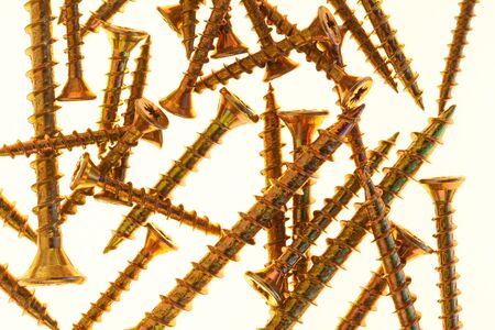 Close up of brass screws against a white background